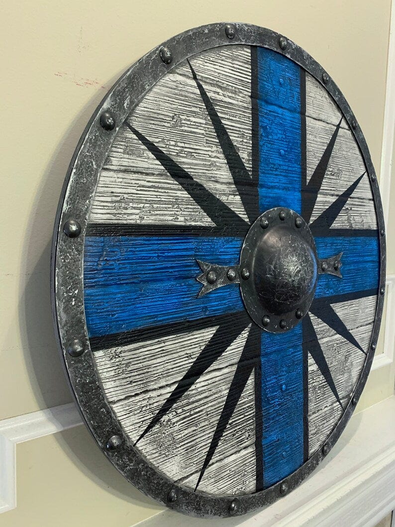 Le Bouclier Viking – Gelstyrkur est une pièce décorative inspirée des traditions nordiques. Ce bouclier circulaire associe une base en bois et des détails décoratifs en métal, ce qui en fait un accessoire idéal pour la décoration intérieure, la collection ou le cosplay.