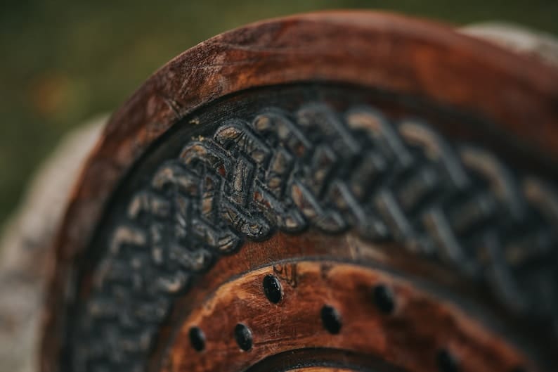 Le Bouclier Viking – Protecteur des Cieux est un objet décoratif inspiré des légendes nordiques et de la culture viking. Fabriqué en bois avec des renforts métalliques, il est parfait pour la décoration intérieure, la collection ou pour servir d’accessoire lors d’événements costumés.