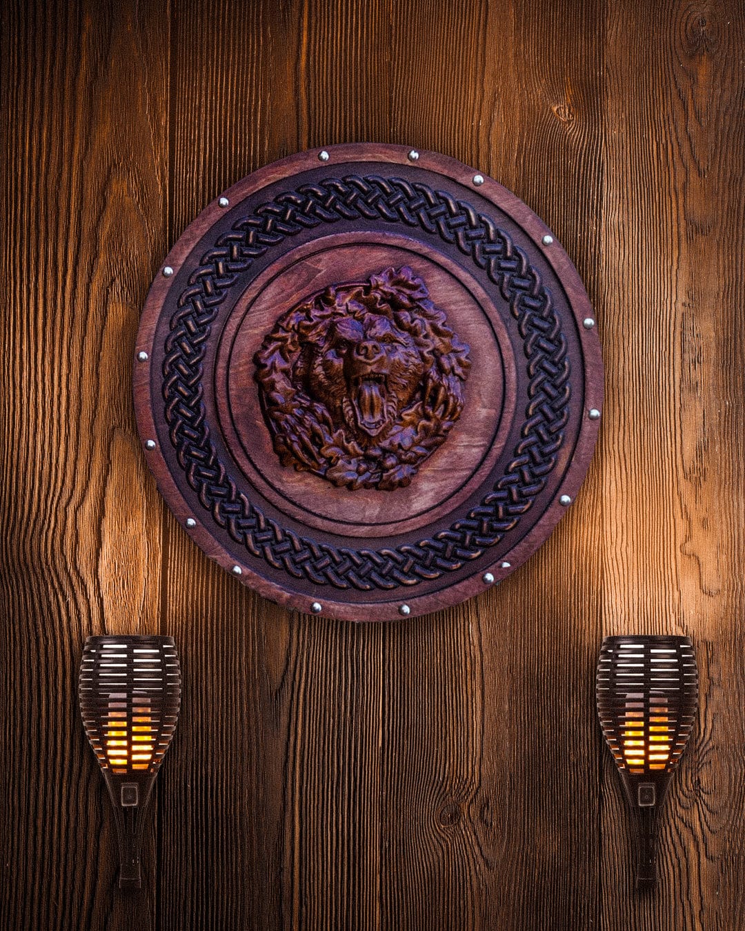 Le Bouclier Viking – Krystallskjold est une pièce décorative inspirée de la culture nordique. Ce bouclier circulaire est fabriqué avec une structure en bois et des détails décoratifs en métal, idéal pour compléter une décoration intérieure, une collection ou être utilisé lors de cosplay et de reconstitutions historiques.